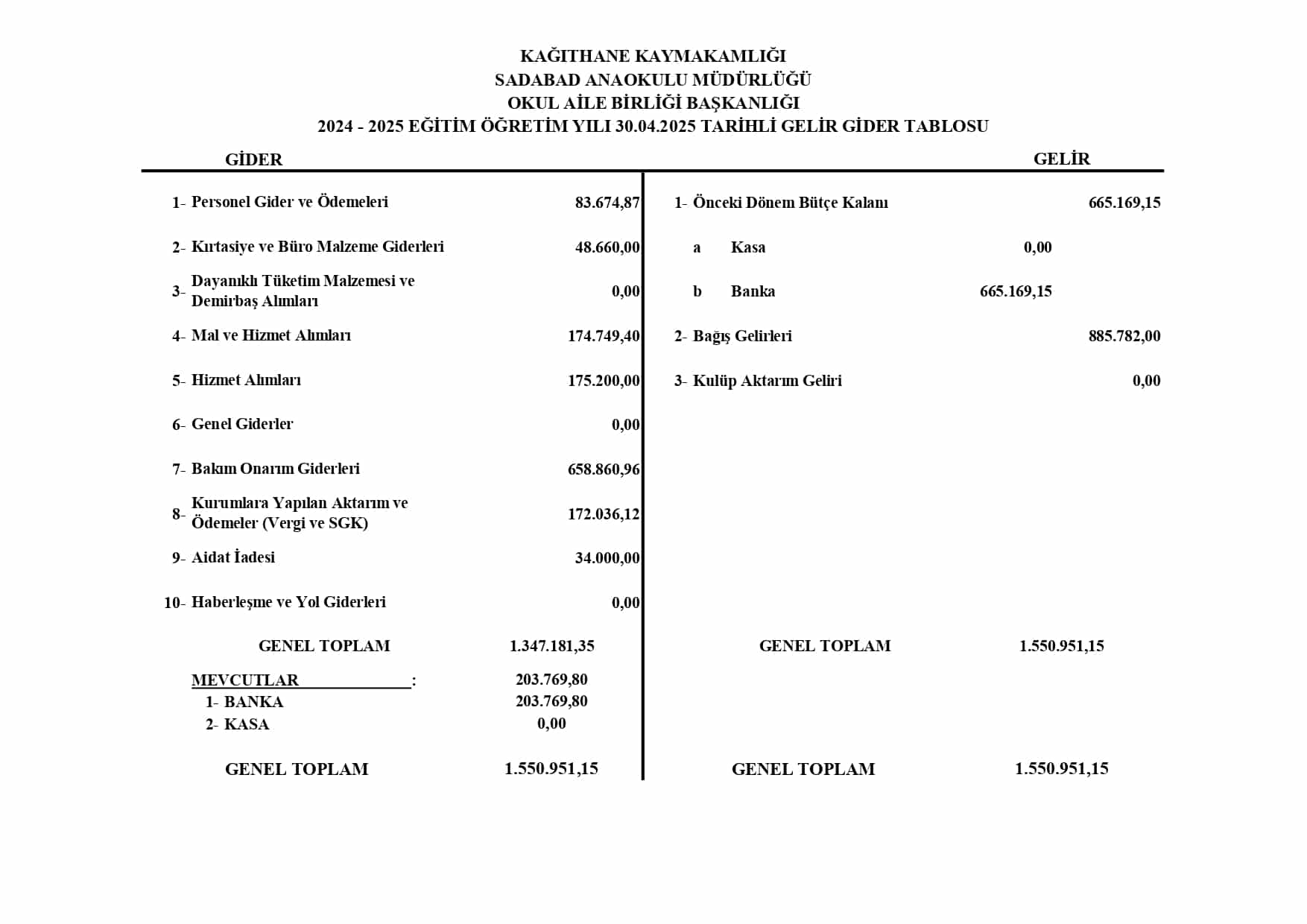 Okul Aile Birliği Gelir Gider Bilgisi